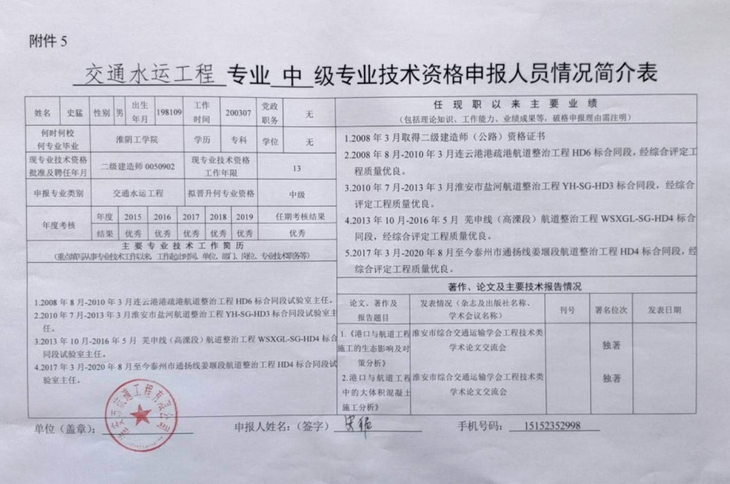 關(guān)于史猛同志申報(bào)交通工程類水運(yùn)工程專業(yè)工程師的公示